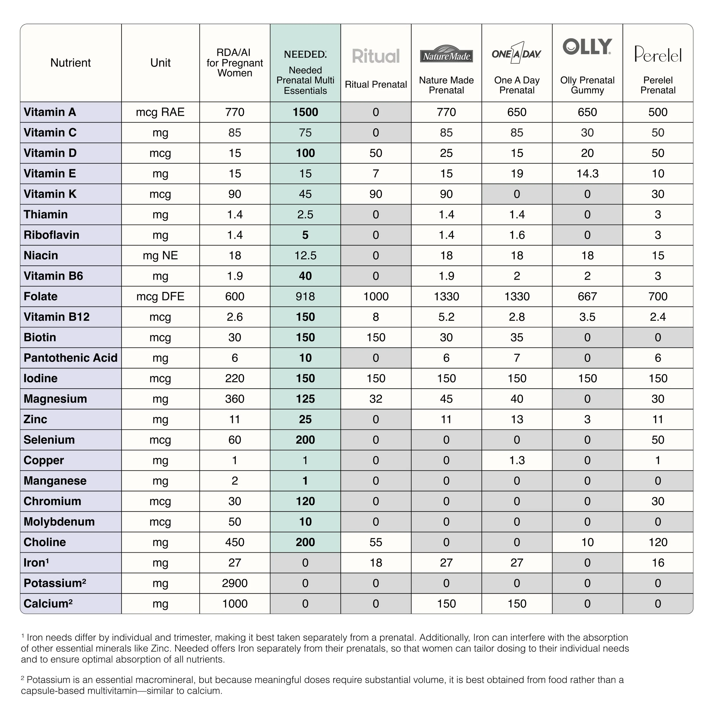 Needed Prenatal Multi has a smart formulation and does not include iron or omega-3s. Iron is best customized based on your unique body’s needs. Iron dosing should be based on your lab work, not everyone needs the same amounts of iron and is best treated when working closely with your Provider to establish if and how much iron you need. Omega-3s are not included to minimize oxidation and should be taken separately for better potency and more optimal dosing. This makes the Needed Prenatal Multi more customized for your needs instead of taking a prenatal that is the same for everyone., Needed understands that your nutritional needs during one of the most demanding times of life will be uniquely yours.